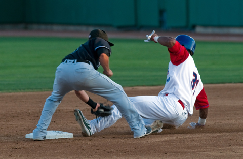 Stockton Ports’ Yusuf Carter slides safely as second beneath the tag of San Jose Giants’ Brian Bocock during a California League game at the Ball Island Ballpark in downtown Stockton.
