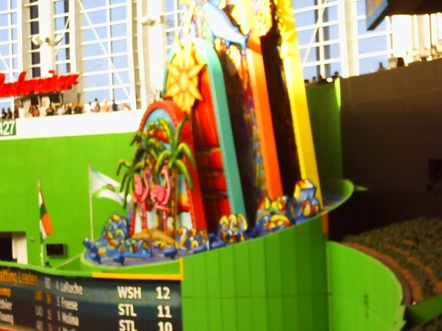 The HR contraption that is the CF wall in MIA. Could the club be relaying signals from opposing catchers by having the fish illuminate during play at New Marlins Ball Park. “Oh Bull Durham” on that.