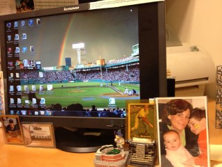 Now, 13 years later, my father still had the photo and was using it as desktop wallpaper on his computer. He had forgotten, however, when it was taken, who was playing the Red Sox, who was batting, and all the other information about this amazing photograph. On the old JumboTron scoreboard at Fenway you can see the number 20 (or maybe 10) faintly, and the other words and numbers are fuzzy too. Also, it’s hard to tell who’s batting (the Red Sox or the visiting team) because all the uniforms seem the same shade of white.