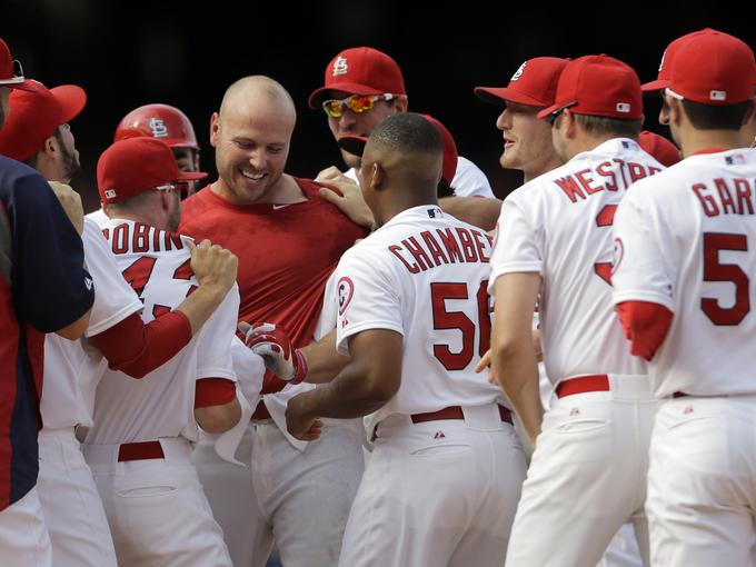 Matt Holliday is mobbed by teammates after his 12th-inning walk-off single that beat the Pirates 6-5 on Thursday. Holliday was 2-for-5 on the day with an RBI double in the 5th inning and the RBI single in the 12th that won the game for the Cardinals.